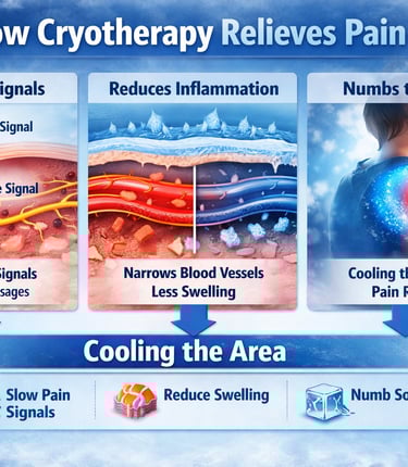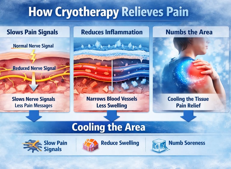 Extreme cold reduces nerve signal transmission speed, providing immediate relief from acute and chronic pain.